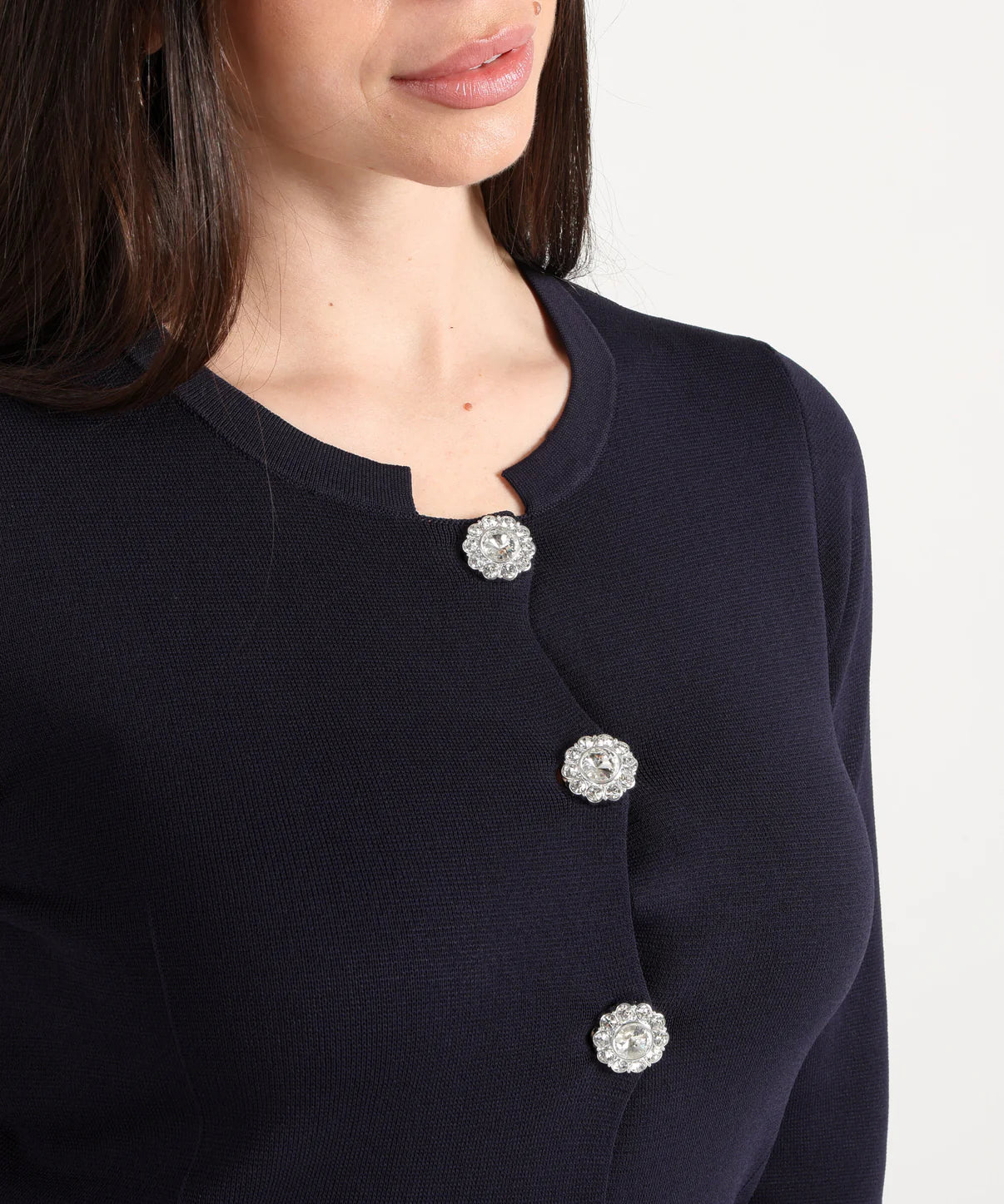 Cardigan con maniche tre quarti, scollo tondo e quattro bottoni gioiello. Elegante e femminile, perfetto per completare il look.